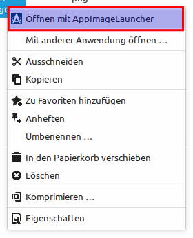 Rechtsklick auf eine AppImage Datei und dann öffnen mit ApplAuncher auswählen.