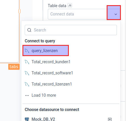 Nun gehen wir in die Eigenschaften des widget klciken auf den Pfeil bei connect Data und wählen unsere gerade erstellte query aus.
