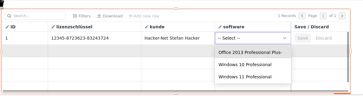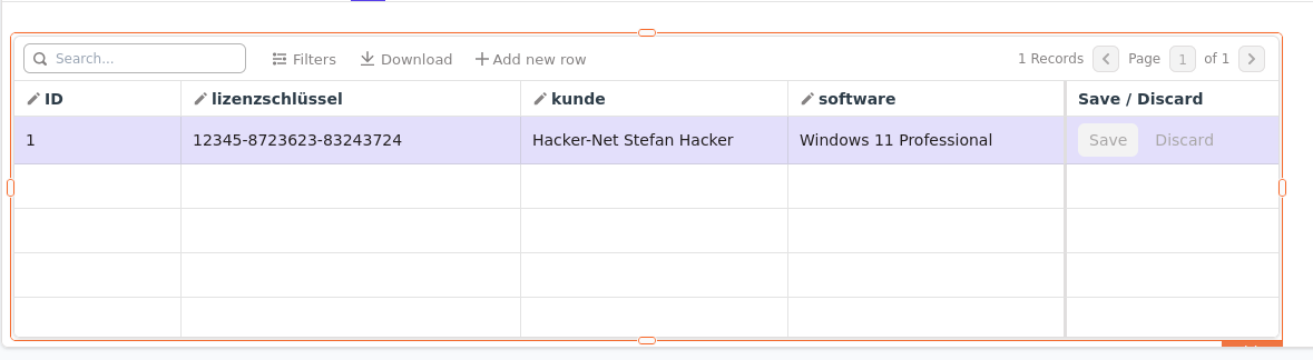 Das widgets angepasst das man die Werte editieren kann (save / discard) und Einen neuen Datensatz hinzufügen kann.