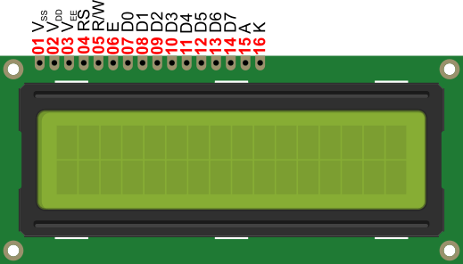 - Pin 15 (A) und Pin 16 (K) existieren nur an LCD mit eingebauter Hintergrundbeleuchtung und dienen der Stromversorgung selbiger. An Pin 15 (Anode) kommt die Versorgungsspannung, Pin 16 (Kathode) wird auf Masse gelegt. Je nach LCD muss hier entweder ein Vorwiderstand für die im LCD verbaute LED vorgeschaltet werden oder aber der entsprechende Widerstand befindet sich bereits im LCD. Wenn man sich unsicher ist und kein Hinweis darauf beim LCD zu finden ist, kann man vorsichtshalber einen 220 Ω-Widerstand einbauen.