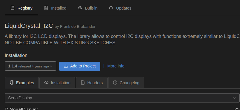 Der Kontrast des LCD Displays kann über das Blaue Potentiometer auf dem Modul eingestellt werden. Die LCD Hintergrundbeleuchtung kann durch entfernen des Jumpers «LED» deaktiviert werden. Für die Ansteuerung gibt es bereits eine fertige Arduino Library, die du im Library Manager unter «LiquidCrystal_I2C» findest.