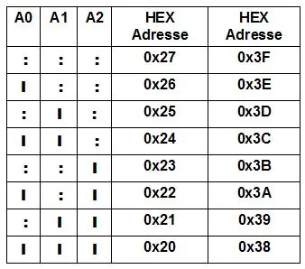 Die HEX-Adresse kann bei dem Display mit Hilfe der A0, A1 und A2 Lötstellen jedoch verändert werden. Im unveränderten Zustand sind alle drei Lötstellen nicht verbunden. Je nach Kombination, welche der Stellen man mit einer Lötstelle überbrückt, sind also 8 verschiedene Adressen möglich. Abhängig vom Display Typ kann diese Adresse anfangs 0x27 oder 0x3F sein (kann mit dem Adressen „Scanner“ herausgefunden werden, dazu später mehr).