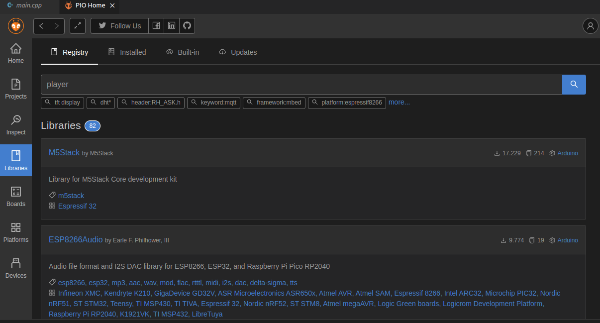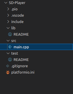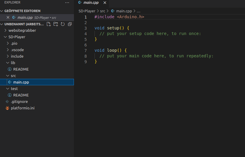 Extra Librays zum Beispiel vom SD Player kommen unter libs unter src main.cpp das ist usnere Startdatei.
