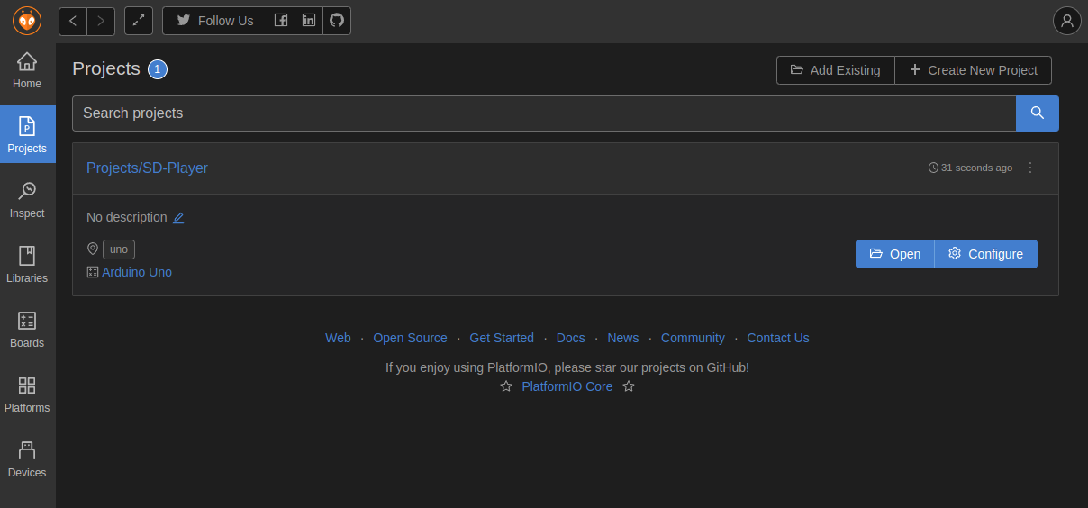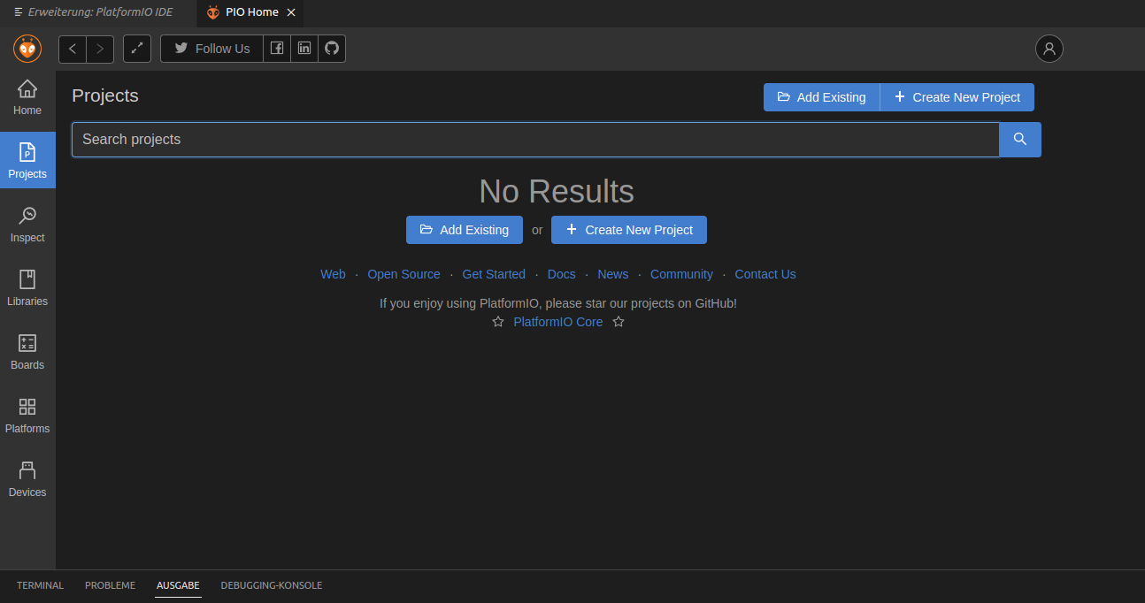 Nun links wieder auf PIO Home und dann Projects klicken. Dort steht unser Project