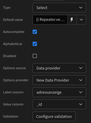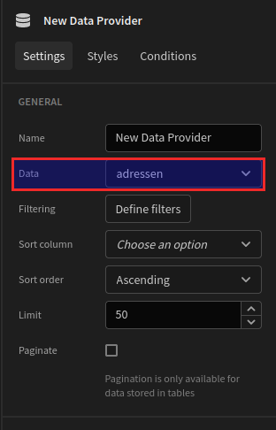 Nun können wir unter Options provider unseren Data Provider auswählen, den eben gerade erstellten