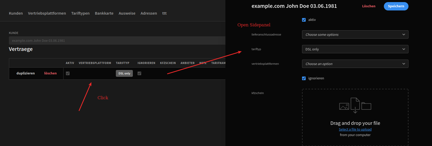 Wenn auf den Vertrag geklickt wird, öffnet sich ein Sidepanel