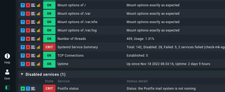 Den Postfix fehler bekommen wir auch nicht weg, da auf diesem System Postfix unkonfiguriert ist. Entweder postfix konfigurieren wenn benötigt oder den Dienst von der Überwachung ausschließen. Wir klicken hier auf das rote X bei Postfix, weil wir den Dienst hier nicht brauchen.
