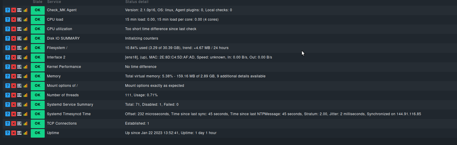 Wenn ein Host hinzugefügt wird und das Discovery durchläuft und auf dem Host ein agent ist, werden in der Regel diese Standard Services (Checks ) gefunden, können je nach System mehr oder weniger sein, je nachdem was verbaut ist.