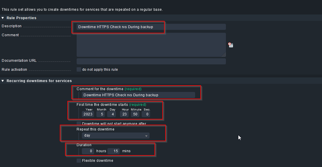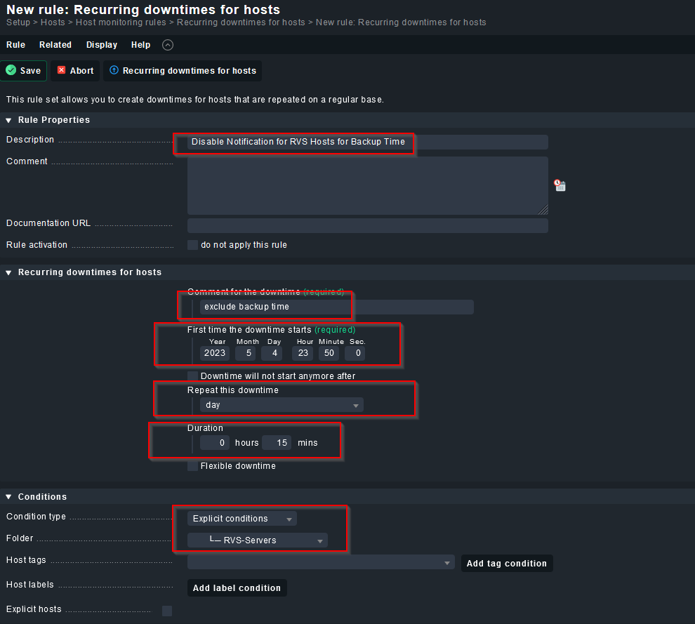 Jetzt haben wir den Namen und können die Downtime regel angelegen