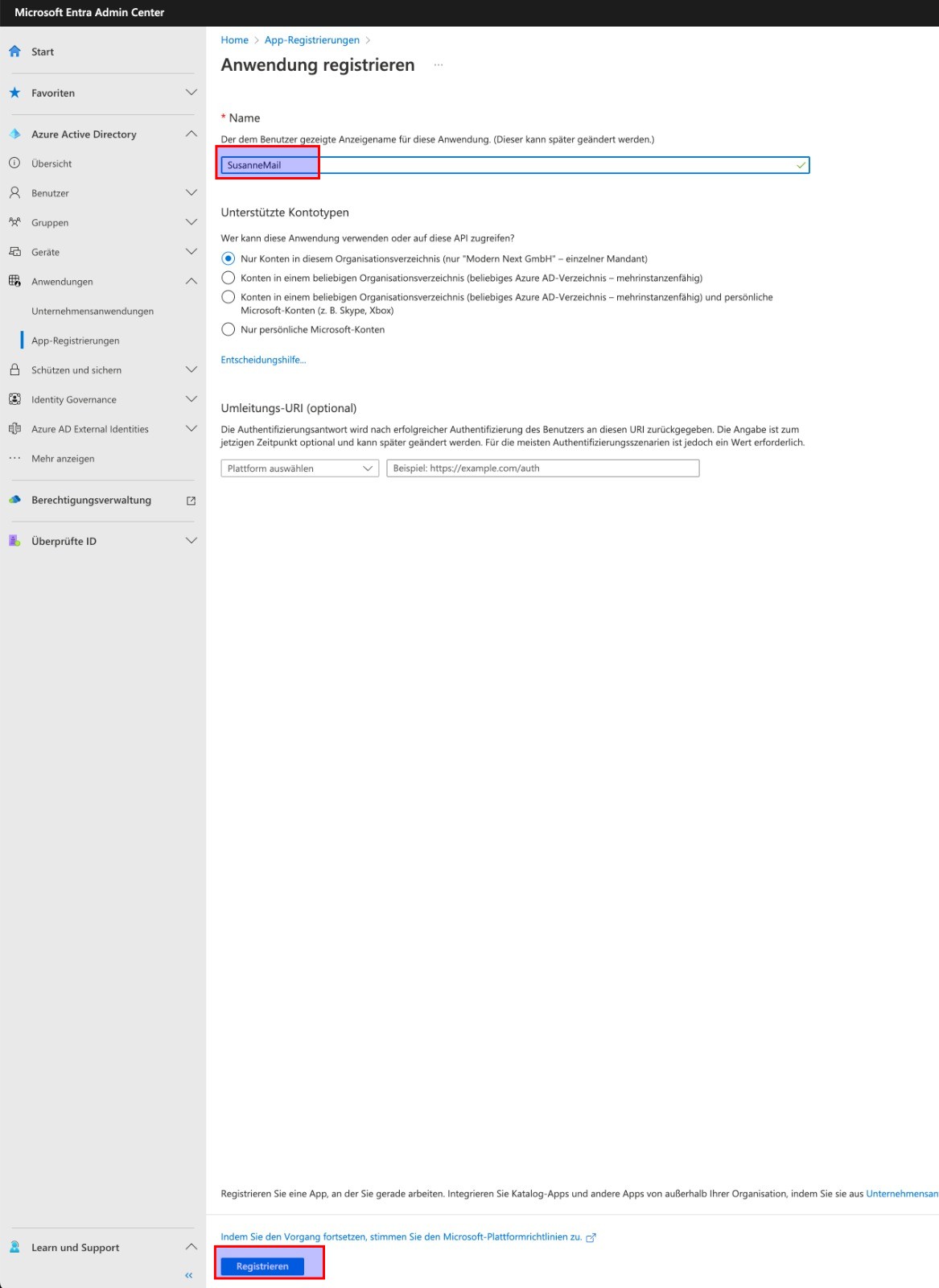 Nun Einen Namen vergeben zum Beispiel SusanneMail und danach ganz unten auf Registrieren klicken