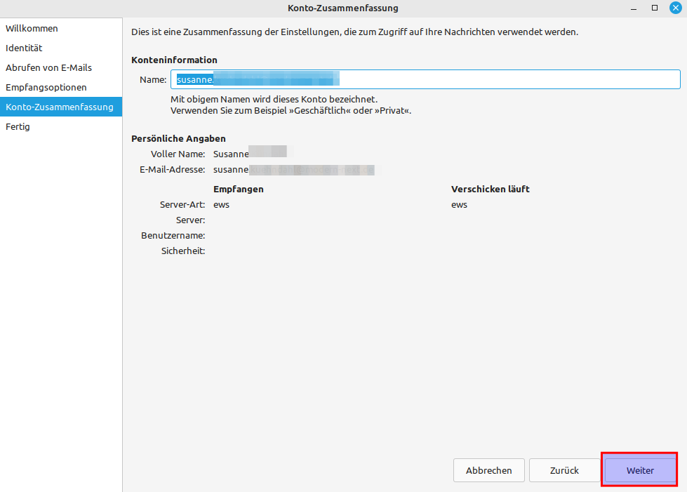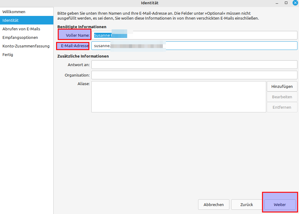 Voller Name und Emailadresse eintragen, dann auf weiter