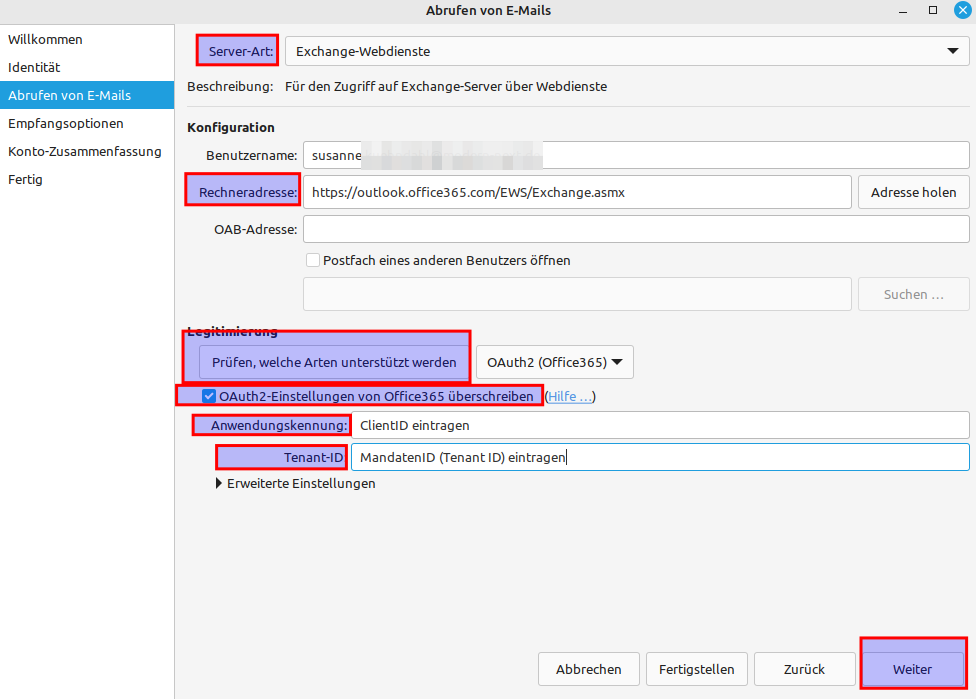 Als Rechneradresse : https://outlook.office365.com/EWS/Exchange.asmx