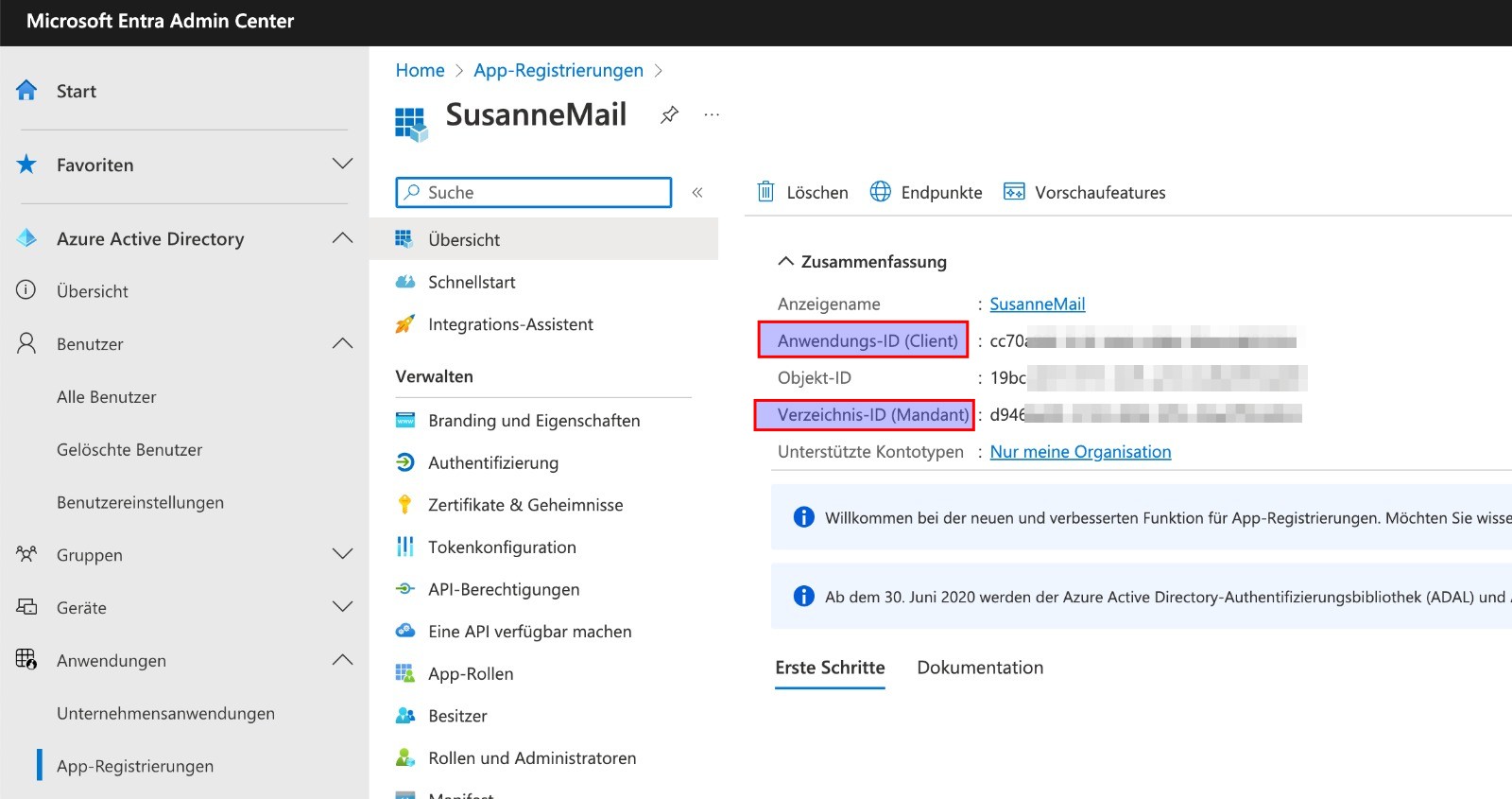 Und nun die Application ID und die Mandanten ID (Tenant-ID ) Notieren / kopieren