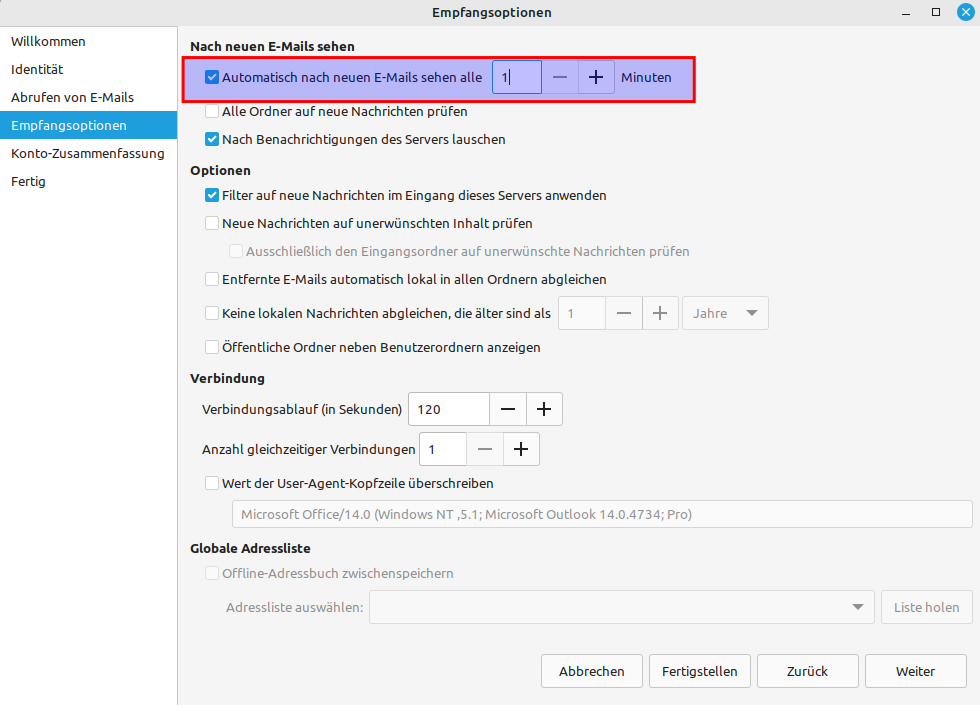 Nun die Zeit zum Abruf auf eine Minute stellen und auf weiter