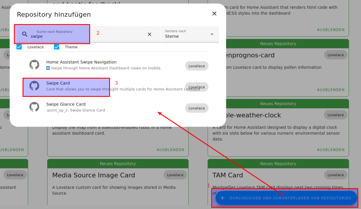 In HACS gehen dann Frontend und dann auf Repo und Suchbegriff eingeben.
