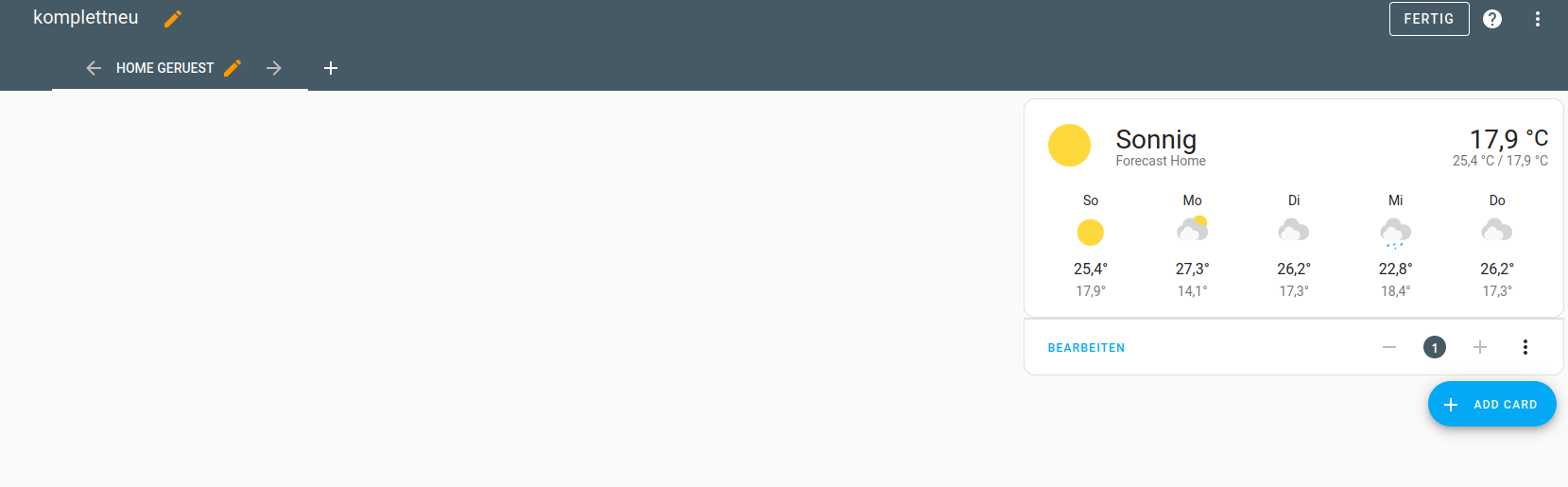 | https://github.com/marcokreeft87/room-card/ entwicklung eingestellt wurde geforkt vom Eintrag drunter | room-card | Eine Karte mit der Sich räume mit einem Oberbegriff Icon ausstatten lässt, was dann eine Gruppe an/ausschalten kann. Dann eine Info Symbolzeile hat und dann noch eine Geräte Liste beinhalten kann. |
