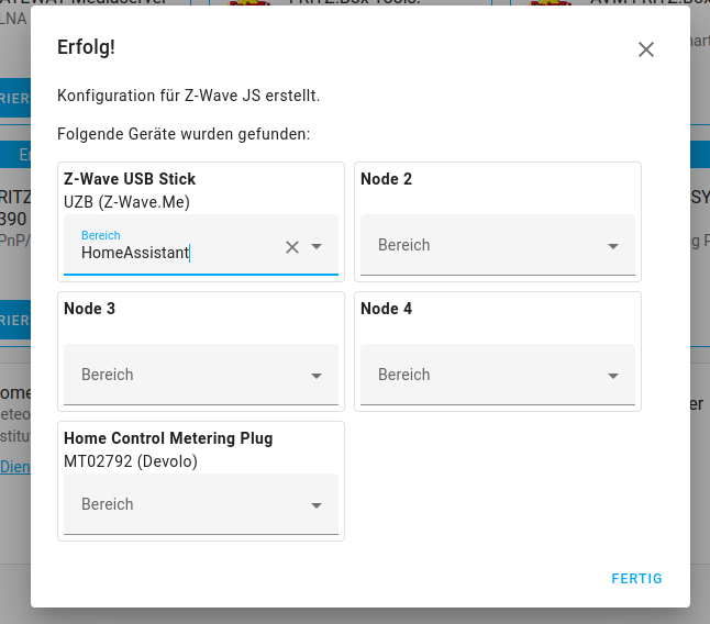 Nun einen Bereich für den Controller auswählen. Und zwar nur für den Z-Wave USB Stick und da wählen wir als Bereich Home Assistent, denn die anderen sind noch die Toten Geräte.