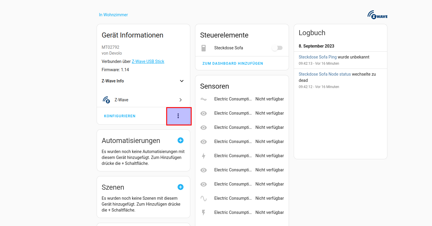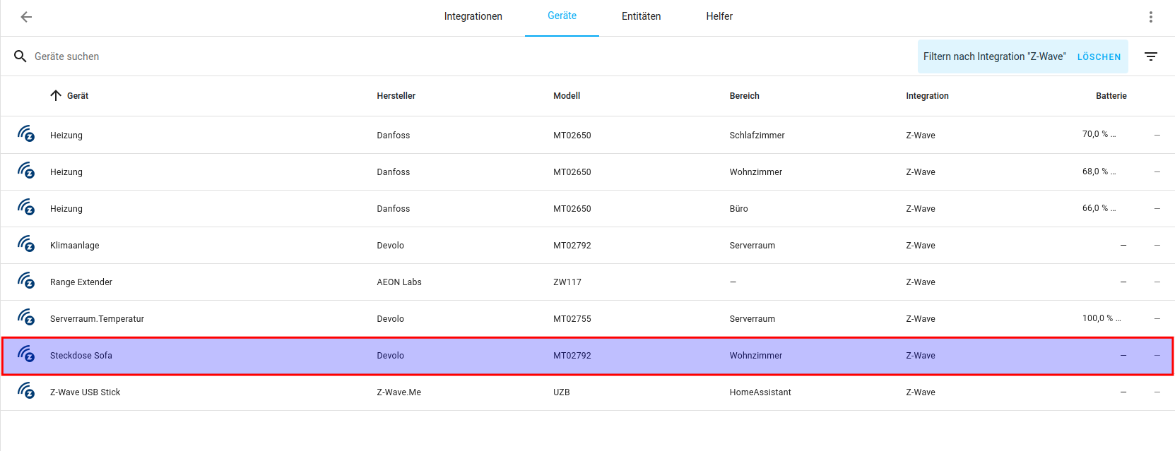 Nun in der Liste auf das Z-Wave Gerät klicken das wir entfernen wollen, bei mir ist es Steckdose Wohnzimmer