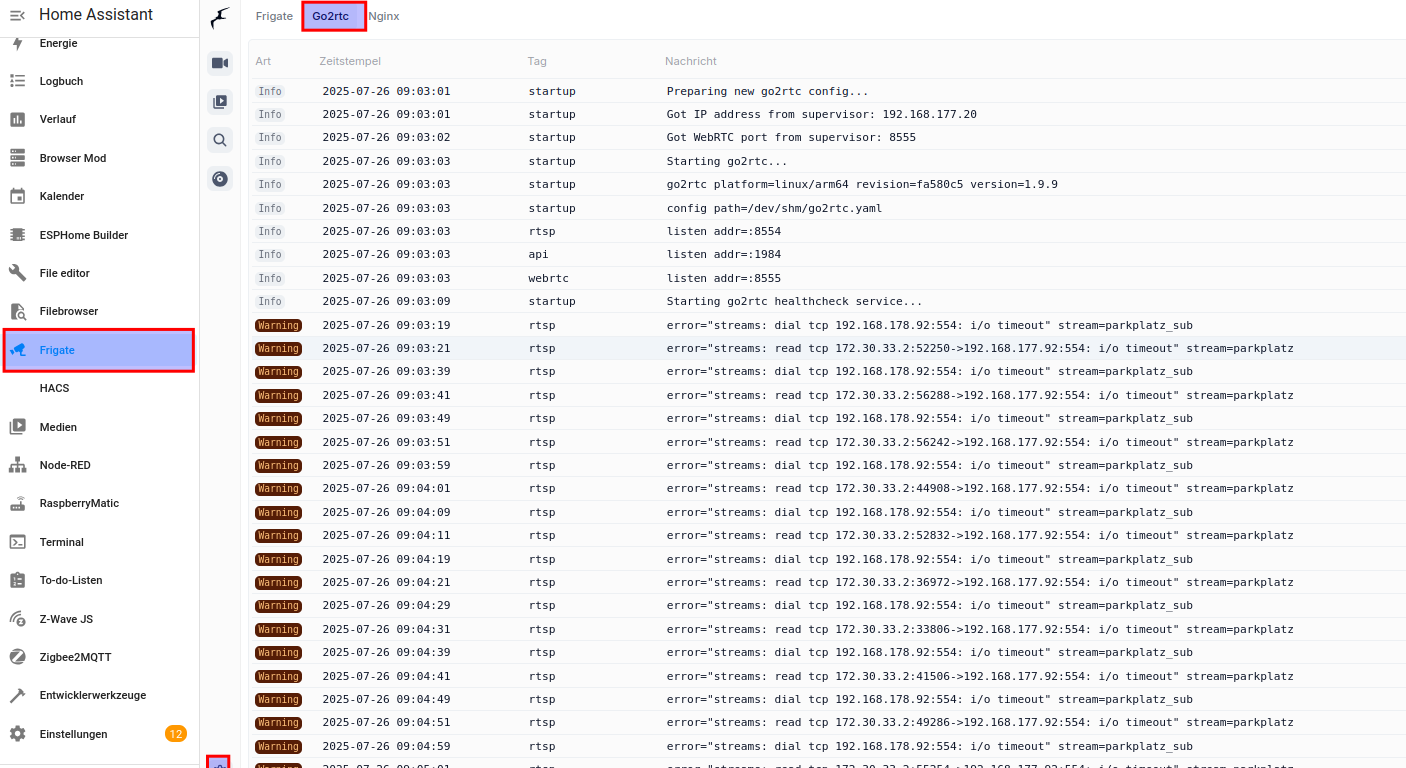 Funktioniert das nicht, dann in Frigate in der Seitenleiste öffnen dann auf Einstellungen -> System logs -> Dann go2rtc