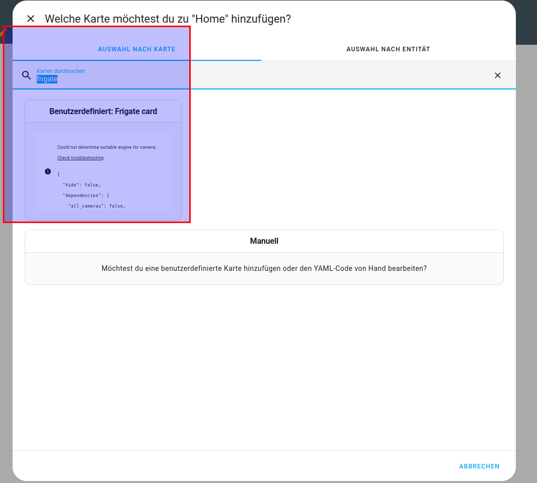 Nun kann im Dashboard eine Karte hingefügt werden, dann auf oben in der suche Frigate eingeben.