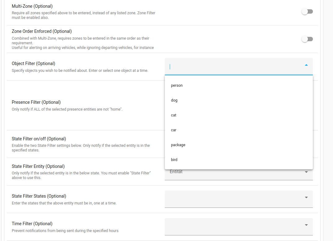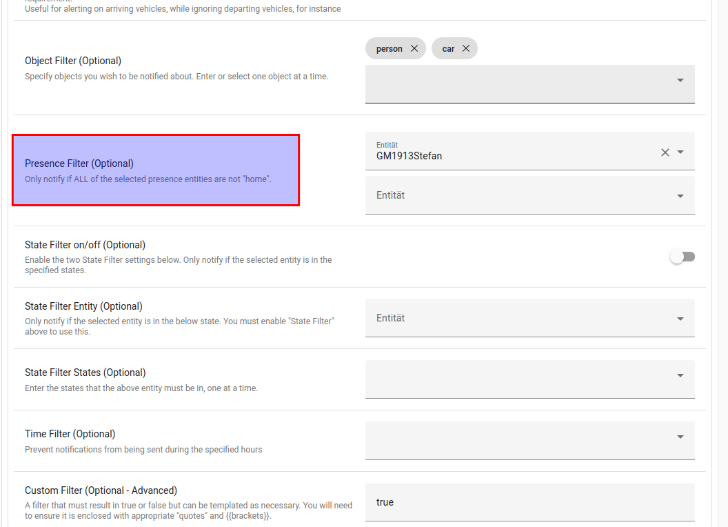 Objekt filter, Nur wenn es Auto und Person ist benachrichtigen, wenns ein Hund ist ignorieren. Das heißt der Hund kommt nicht mit in die Liste