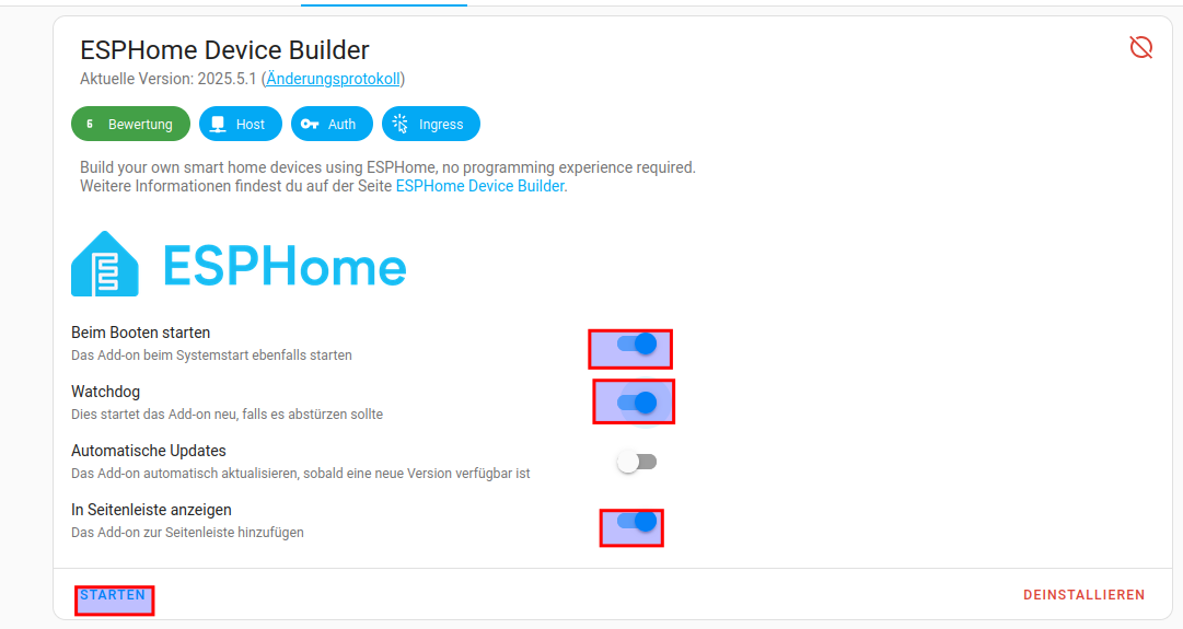 - Einmal auf dem Home Assistant selber (Vorteil, LOGS und OTA Updates und ESP32 direkt anschließen und yaml flashen)