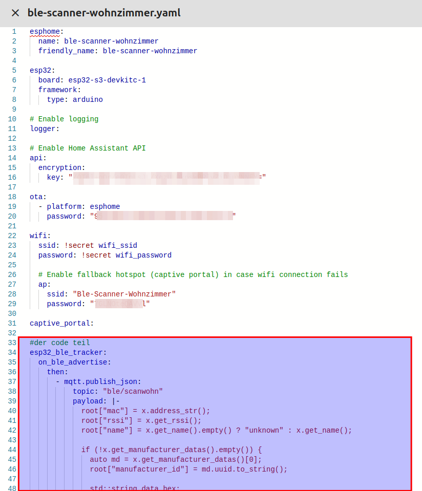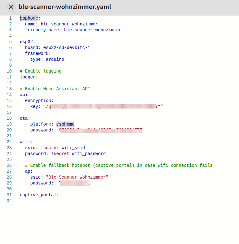 Man kann diese aber auch als Varibalen in der Secrets Datei ablegen dann sehe der WLAN und MQTT block so aus