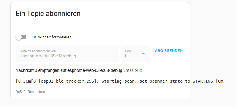 Der Wert esphome-web-039c08/debug ist der Topic fürs log