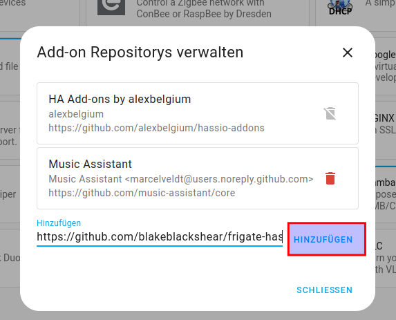 Nun ist die Repo drin und auf schließen klicken, danach den browser mit F5 refresh durchführen