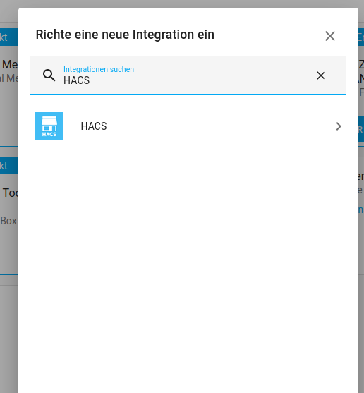 Dort in das Suchfeld HACS eintippen und HACS aus der Liste auswählen.