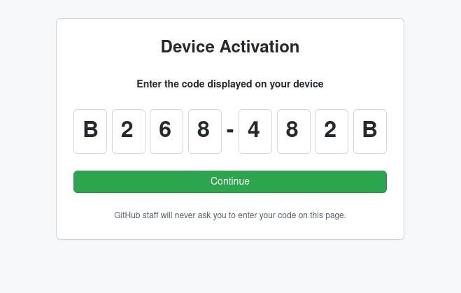 Nun mit Github verbinden und die Nummer unten eintippen. Hier B268-482B