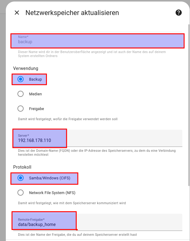 Einen Dateiserver mit Samba oder NFS oder anderen Daten bzw Freigegeben IP vom Home Assistant wie es bei NFS der Fall ist.