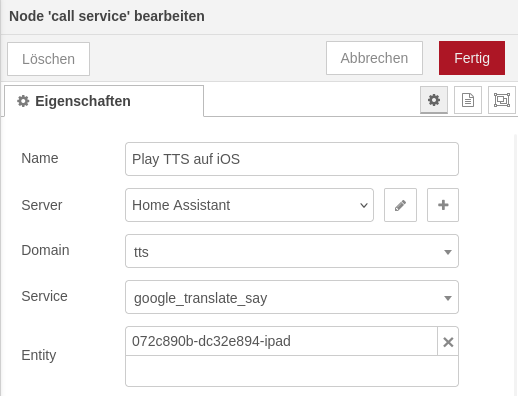 Um TTS Benachrichtungen zu senden, erstelle wir einen Service call.
