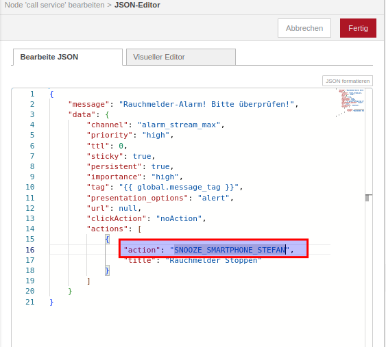 { "message": "Rauchmelder-Alarm! Bitte überprüfen!", "data": { "push": { "category": "alarm" } } }