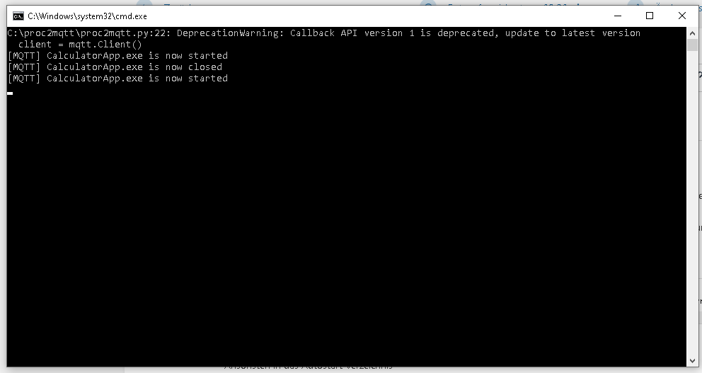 pythonw "C:\proc2mqtt\proc2mqtt.py" --broker 192.168.177.20 --port 1883 --username mqtt_username --password mqtt_password --topic proc/calc --process CalculatorApp.exe --onmsg started --offmsg closed