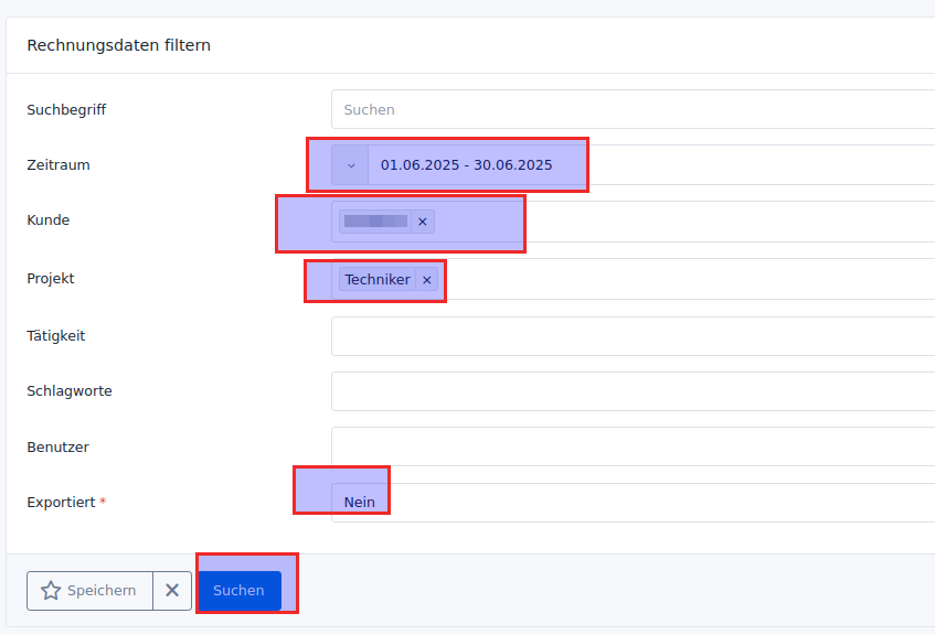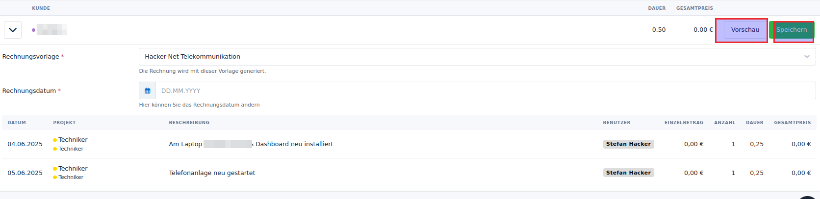 Durch klick auf Speichern werden alle Eintrage auf eien Rechung / Leistungsnachweis gepackt.