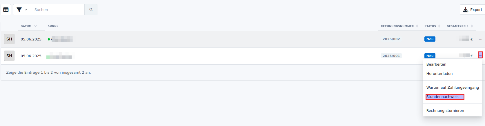 Nun kann Unter Rechnungen -> rechnungshistorie dier Stundenzettel downgeloaded werden