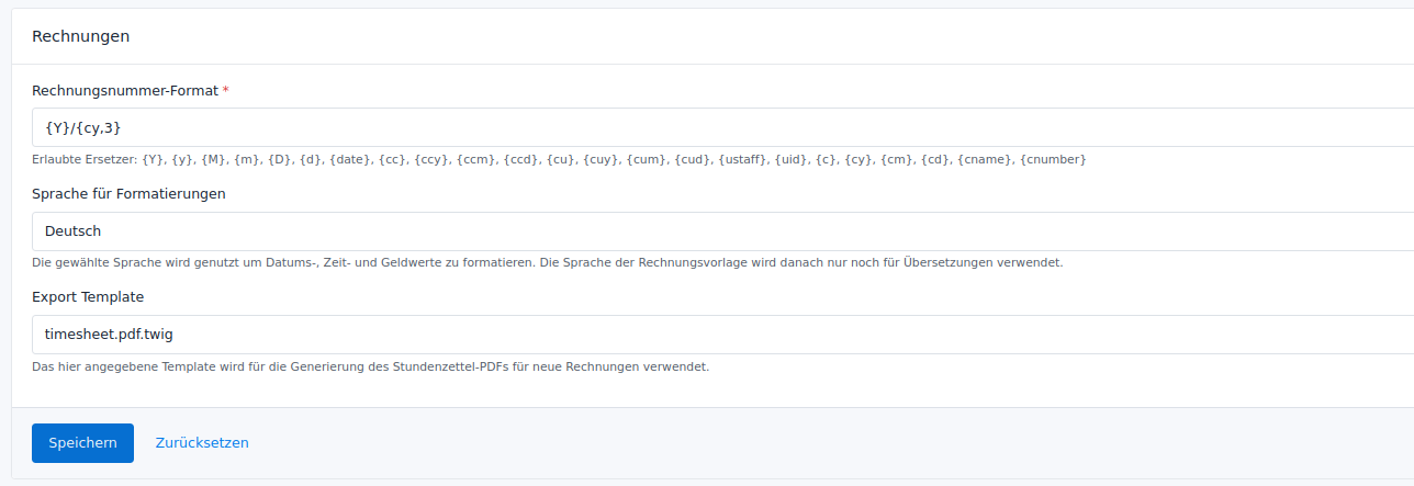 Dort Rechungsnummerformat Sprache und template für den Stundenzettel Rechung einstellen
