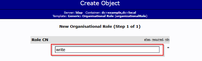 nun eine weitere elemt vom typ organizationRole mit den namen write anlegen