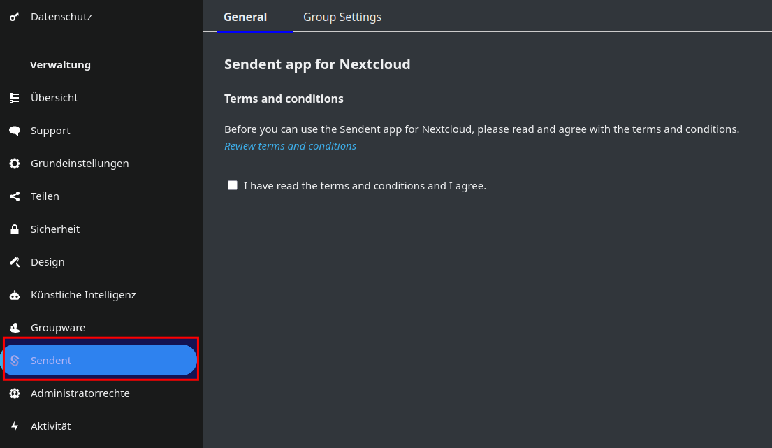 In der Nextcloud anmelden und im App store die Sendent App downloaden