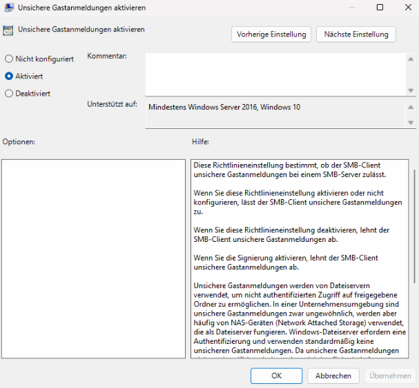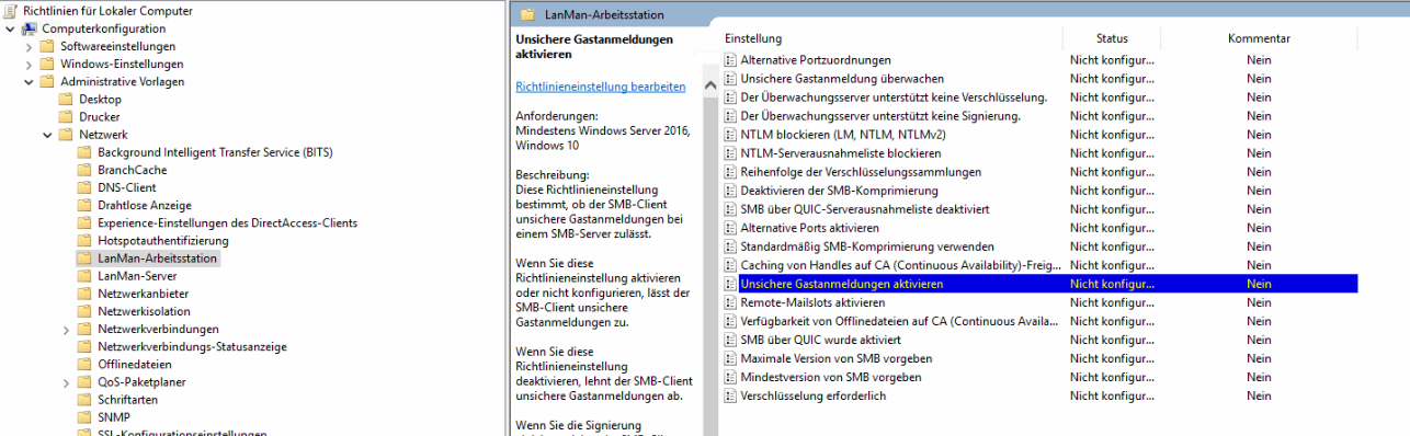SMB Freigabe ohne Passwort muss auf Client freigeschaltet werden