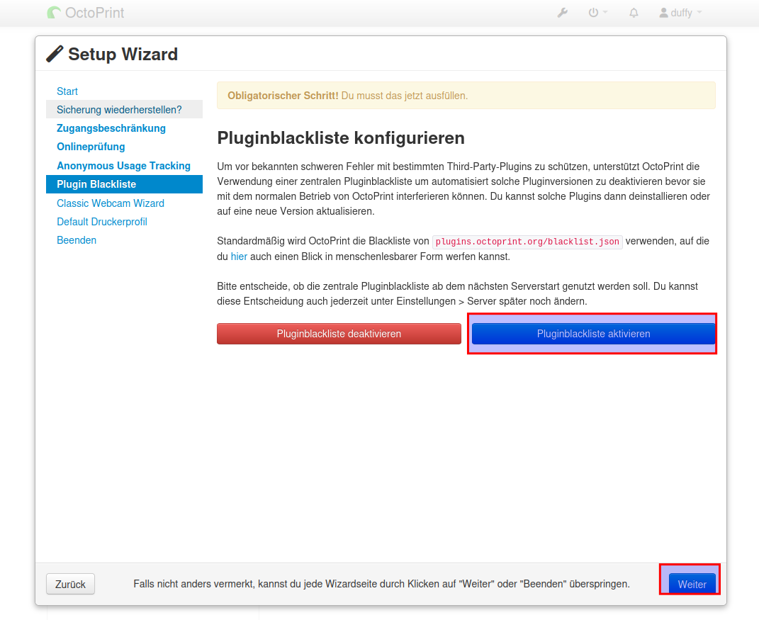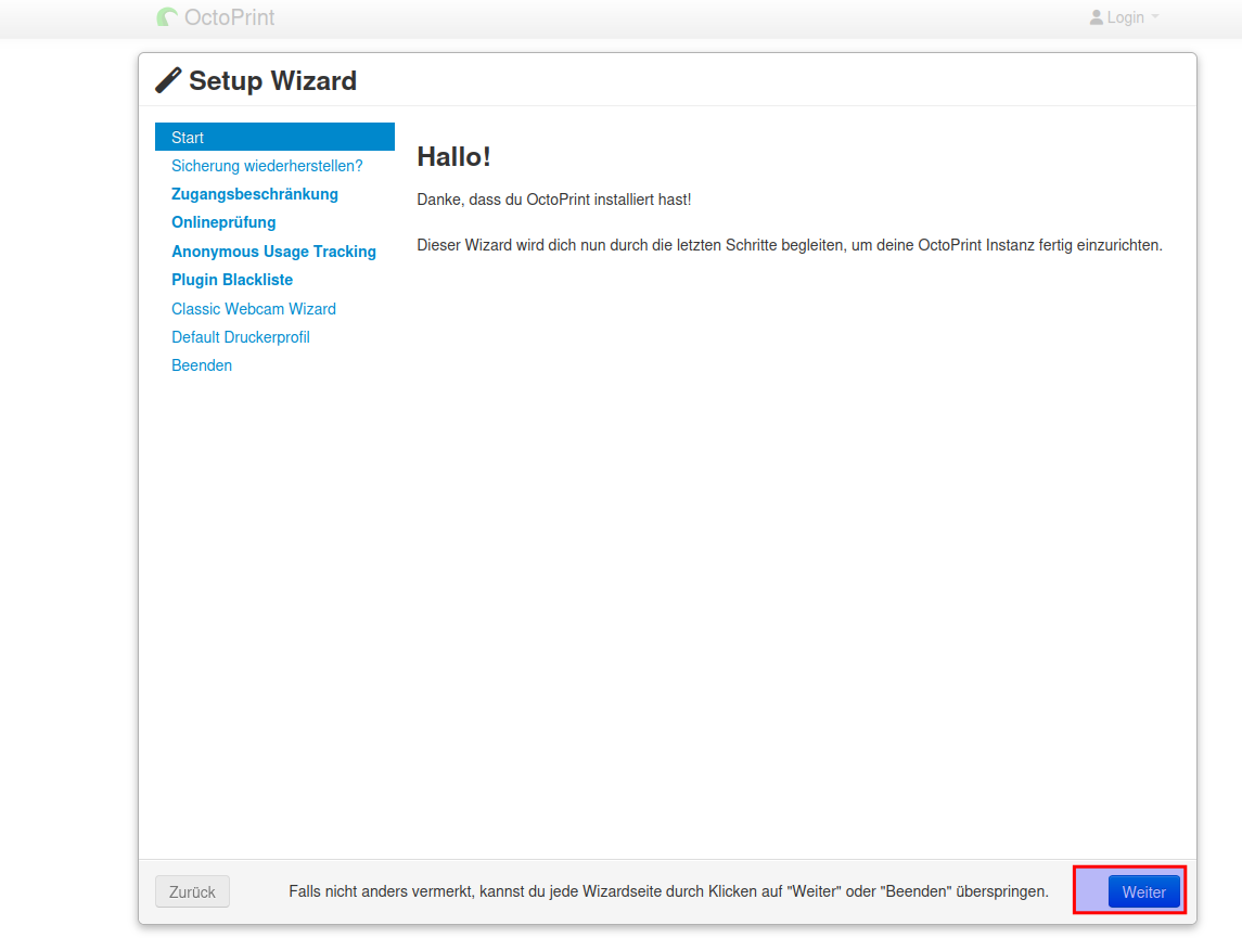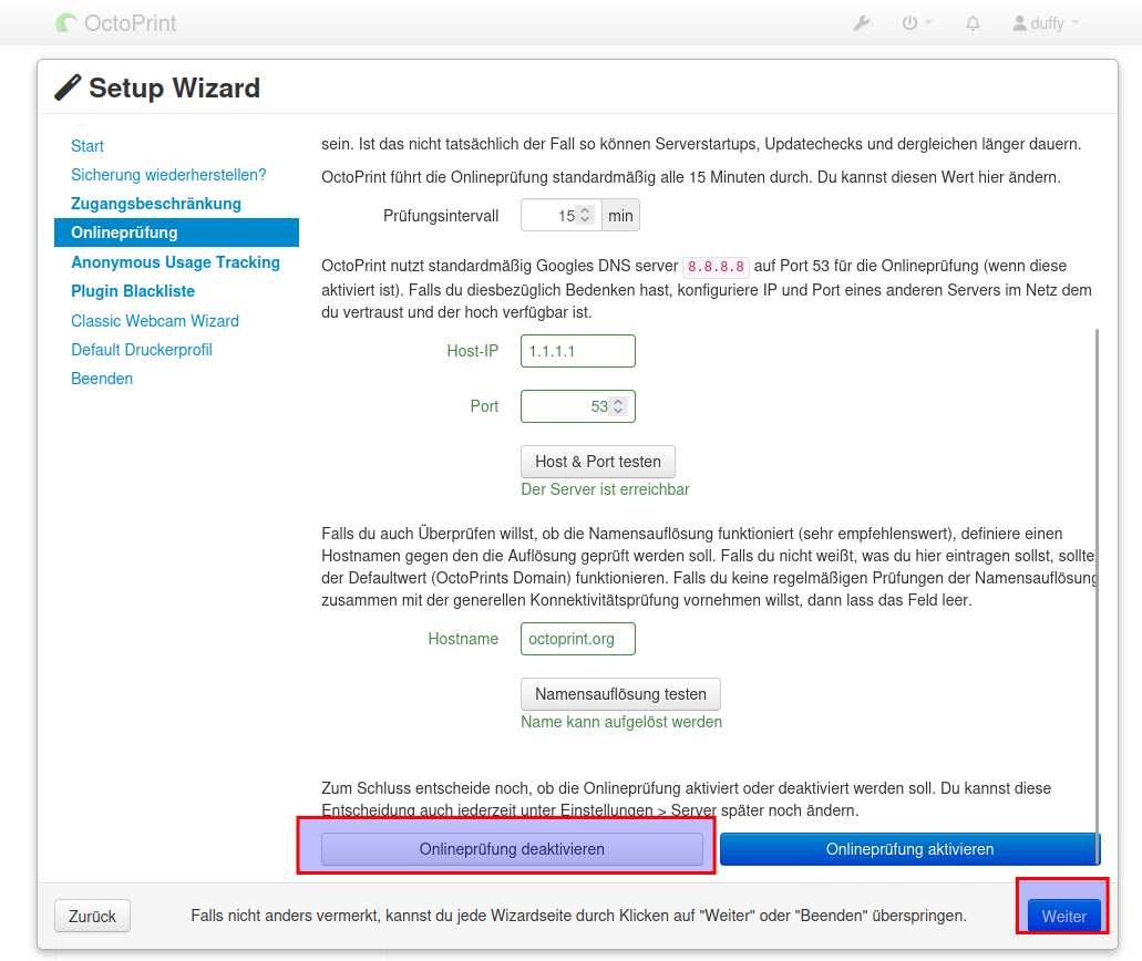 Online Prüfung deaktivieren anklicken und weiter, denn der Octoprint ist eh nur über Tunnel erreichbar