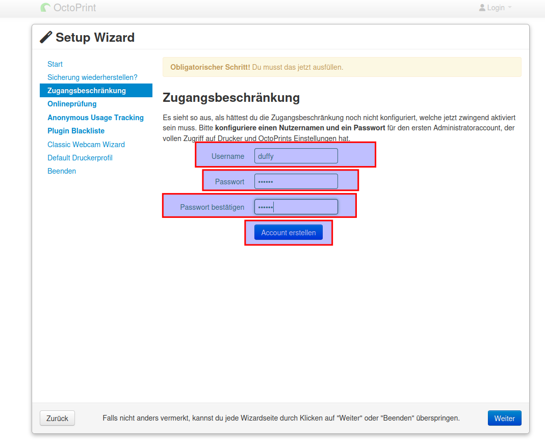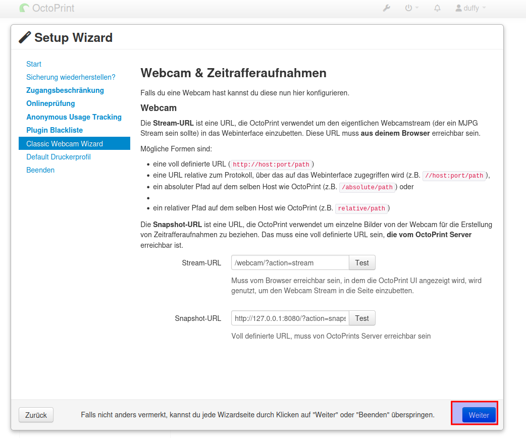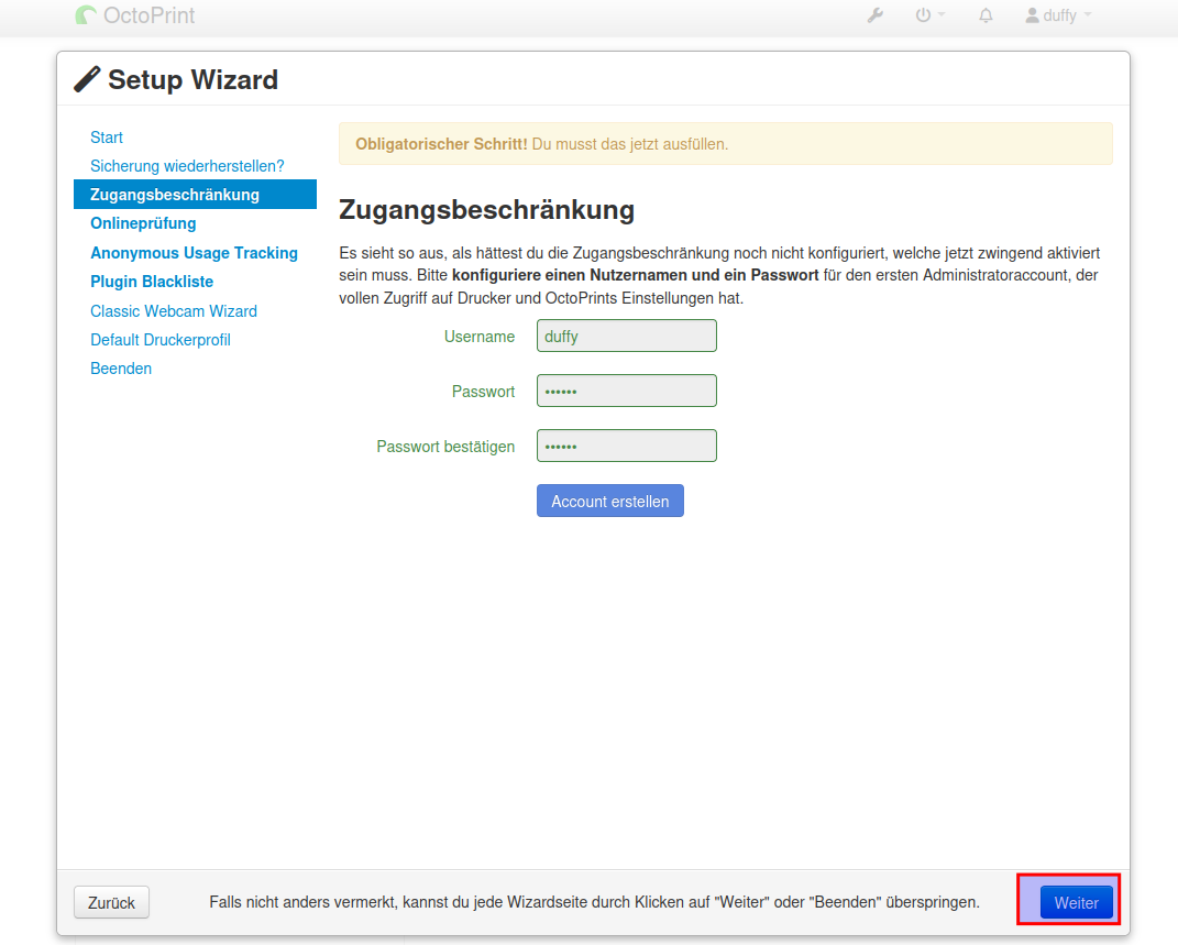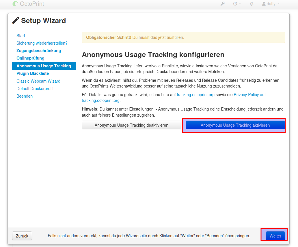 Online Prüfung deaktivieren anklicken und weiter, denn der Octoprint ist eh nur über Tunnel erreichbar