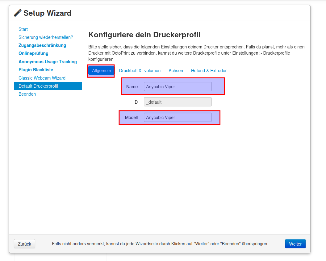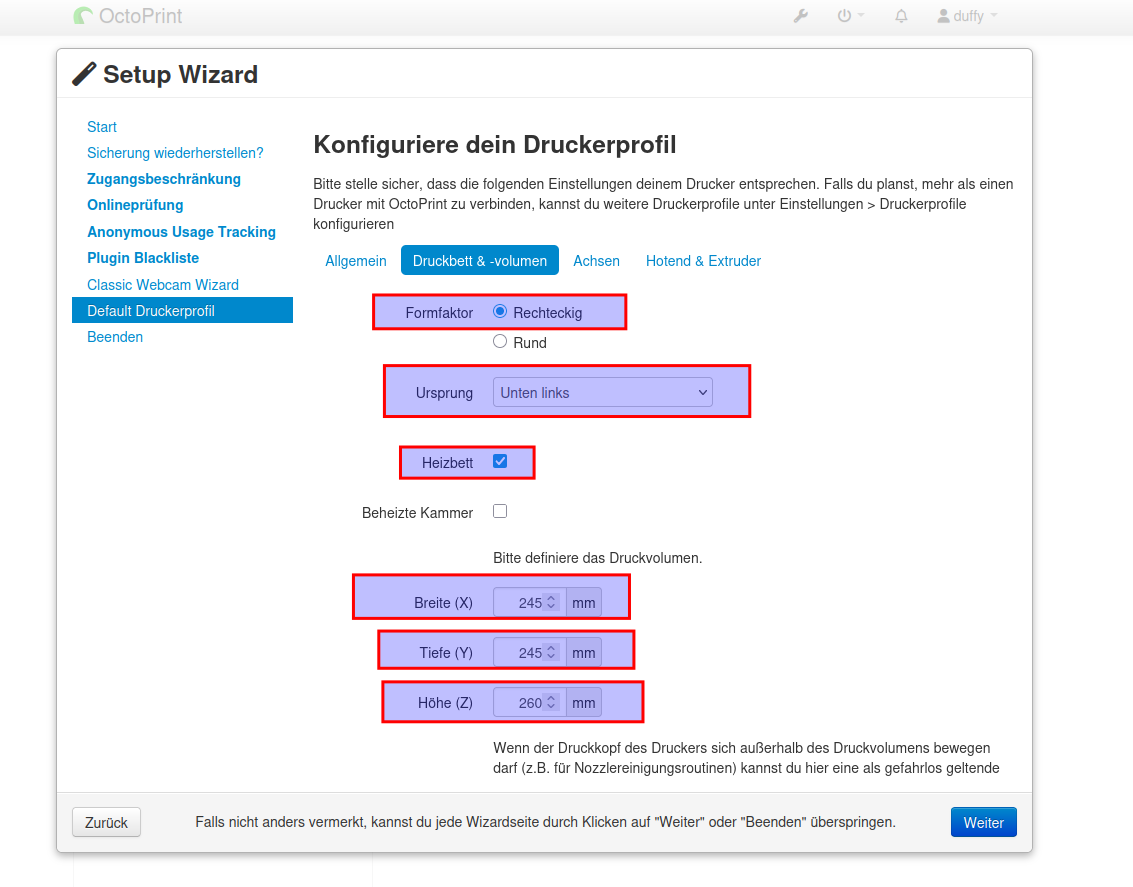 Unter Druckbett & Volumen anklicken ausfüllen und dann weiter klicken