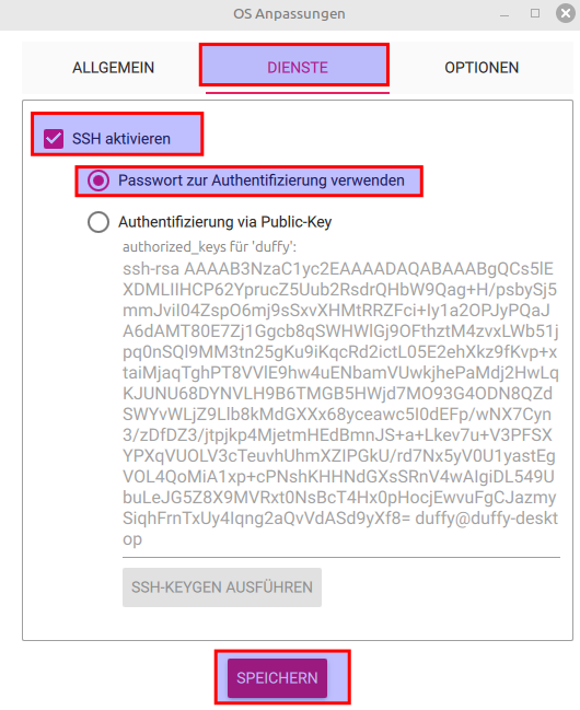 Nun unter Dienste SSH aktivieren mit Passwort Authentifizierung