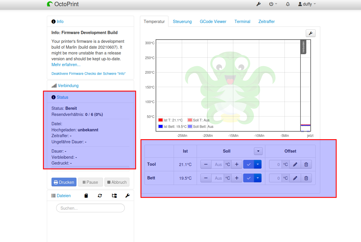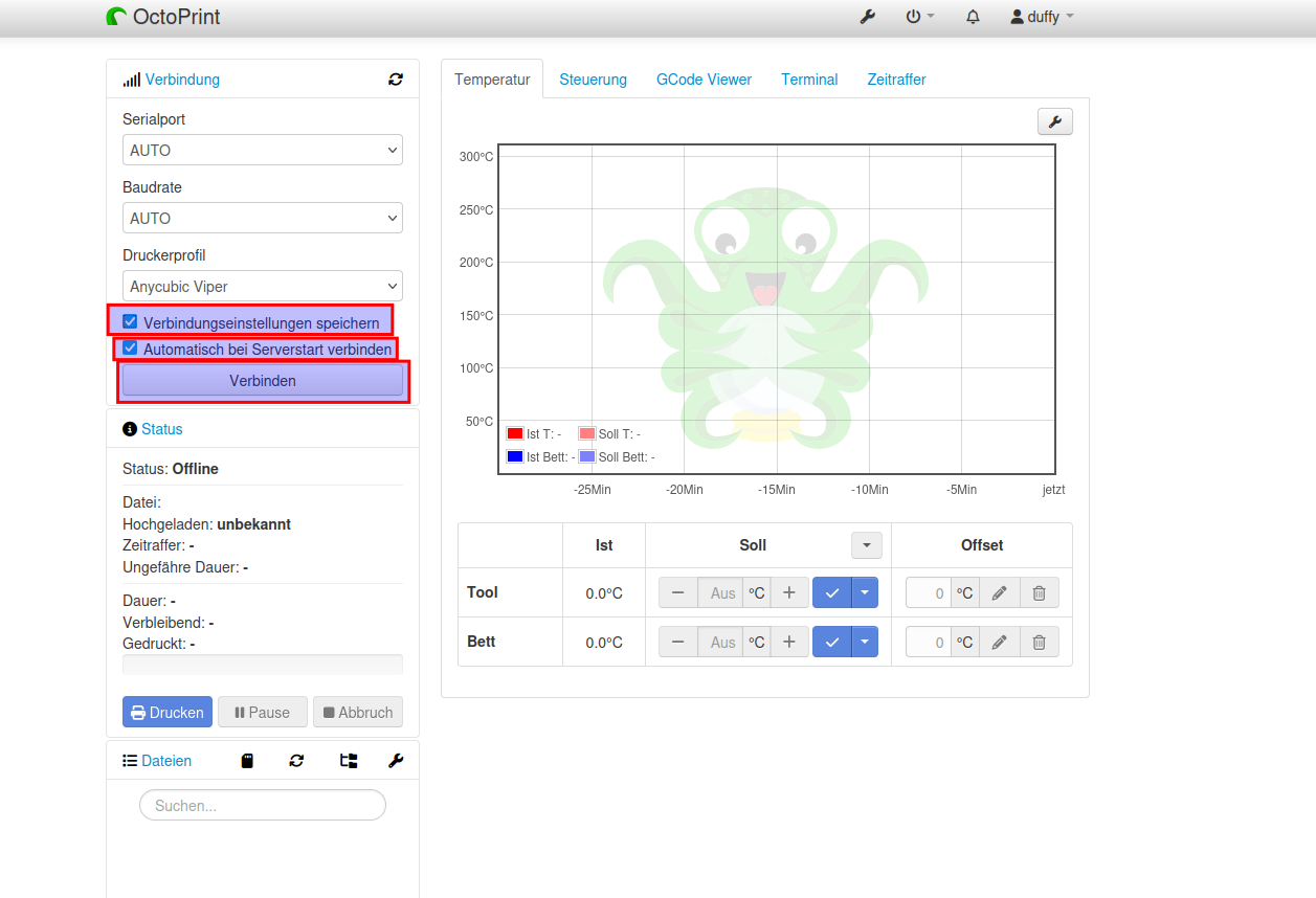USB Kabel mit dem Drucker verbinden und mit Strom anschließen, der Octoprint sollte sich nach einem kurzen Moment dann auch im WLAn einloggen.