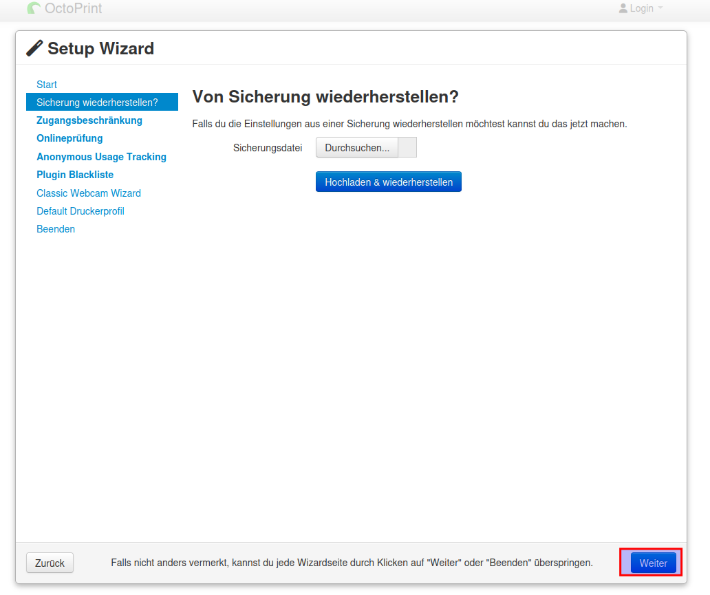 Jetzt haben wir ne Möglichkeit ein Backup einzuspielen wenn wir eins haben. Bei der Ersteinrichtung haben wir zwar keins, aber wir wissen jetzt das wir in Schritt zwei eins wiederherstellen können über den Durchsuchen Button und dann hochladen wiederherstellen in Backup einspielen.