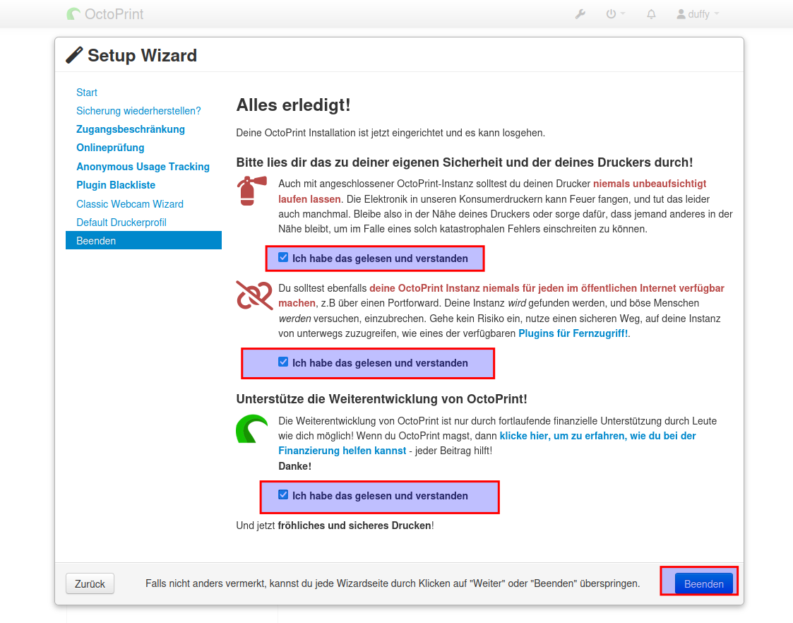 Zum Schluss alle Sachen akzeptieren und dann beenden