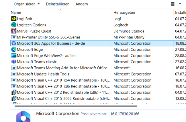 nun die Software Liste aktualisieren und wir sehen Microsoft 365 Apps for Business - de-de ist aus der Liste weg.
