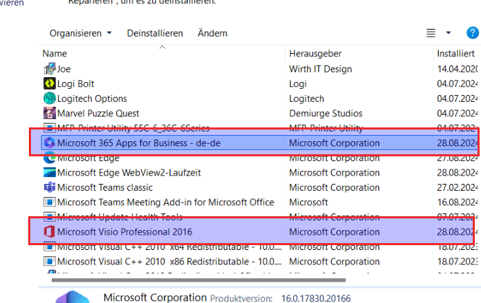 Microsoft 365 Apps for Business - de-de wieder in der Liste und das Visio 2016 Professional in MSI Version